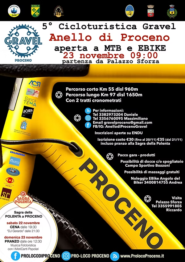 Domenica 23 novembre si svolgerà la 5a cicloturistica Gravel Anello di Proceno, partenza alle ore 9 da Palazzo Guido Ascanio Sforza, aperta a MTB e e-bike, con due percorsi da 55 e 97km.